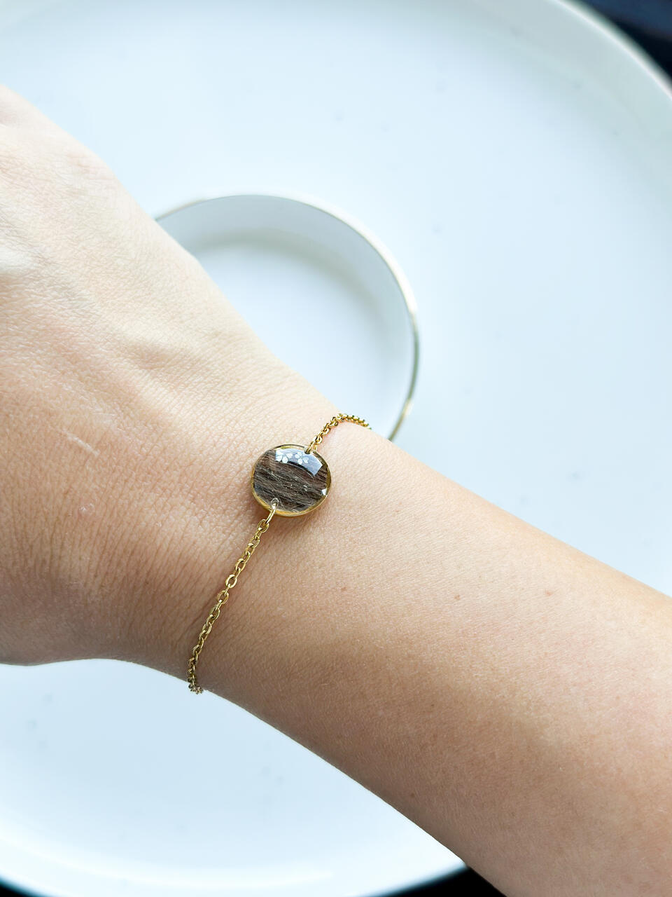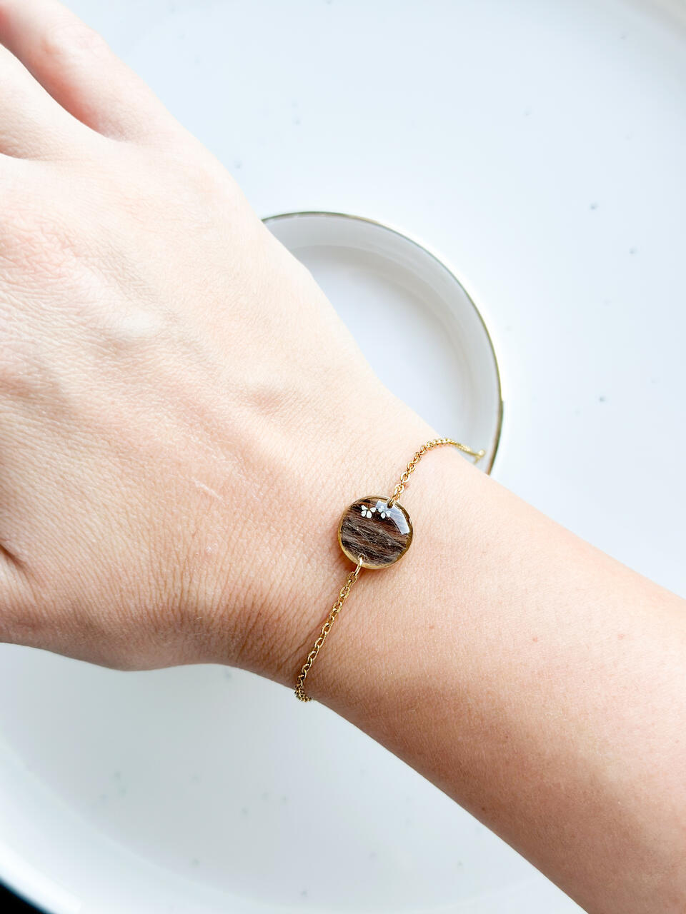 Bransoletka wykonana jest z delikatnego łańcuszka z regulowaną długością, a w jej centrum znajduje się okrągła zawieszka (1 cm) wypełniona sierścią Twojego pupila oraz drobnym, białym kwiatem marchwii zwyczajnej – symbolem czystości, wdzięczności i pamięci.