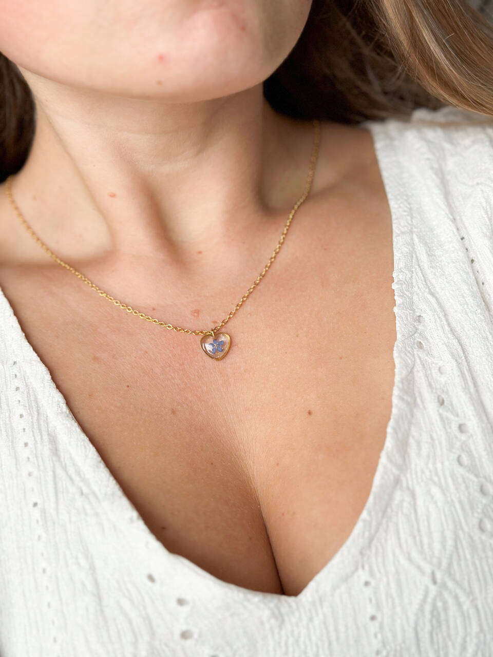 Odkryj delikatność natury w minimalistycznej formie. Ten subtelny naszyjnik w kształcie serca zachwyca prostotą i elegancją. W przezroczystej żywicy epoksydowej zatopiono jedną prawdziwą niebieską niezapominajkę, symbol miłości, wierności i pamięci. Złote wykończenie ze stali chirurgicznej dodaje biżuterii klasy i ciepłego blasku.