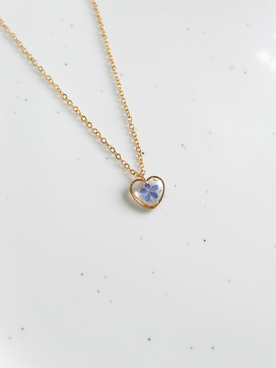 Delikatny naszyjnik z prawdziwymi kwiatami serduszko z żywicy. Ręcznie robiony naszyjnik z kwiatami – naturalny naszyjnik z niezapominajką.