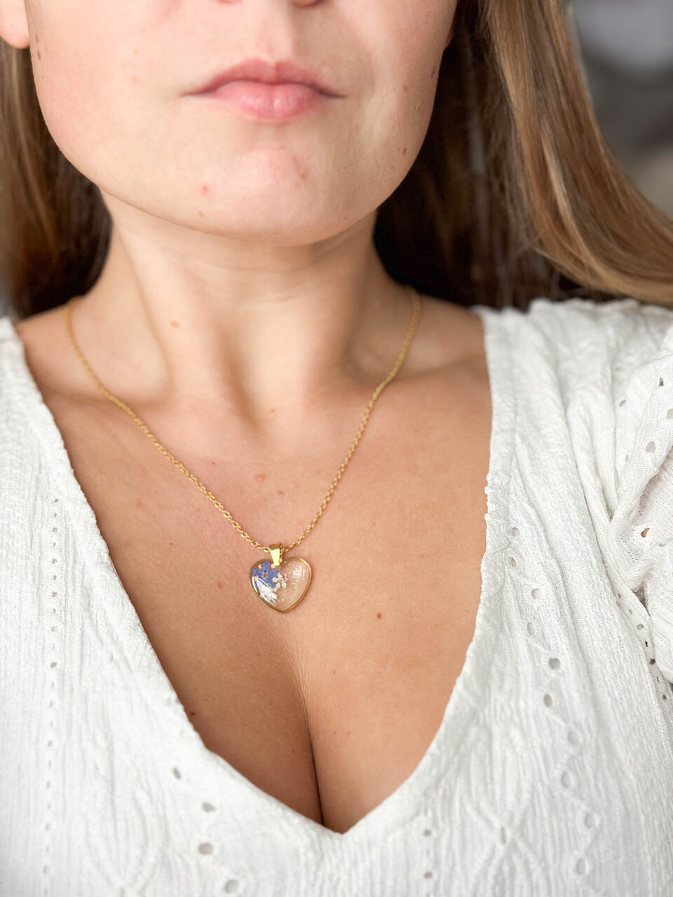 Poznaj urok natury zamknięty w eleganckim, ręcznie wykonanym naszyjniku w kształcie serca. W przezroczystej żywicy epoksydowej zatopiono prawdziwe, suszone niebieskie i białe niezapominajki, które symbolizują pamięć, miłość i wierność. Złote wykończenie stali dodaje całości delikatnego blasku i ponadczasowego charakteru.