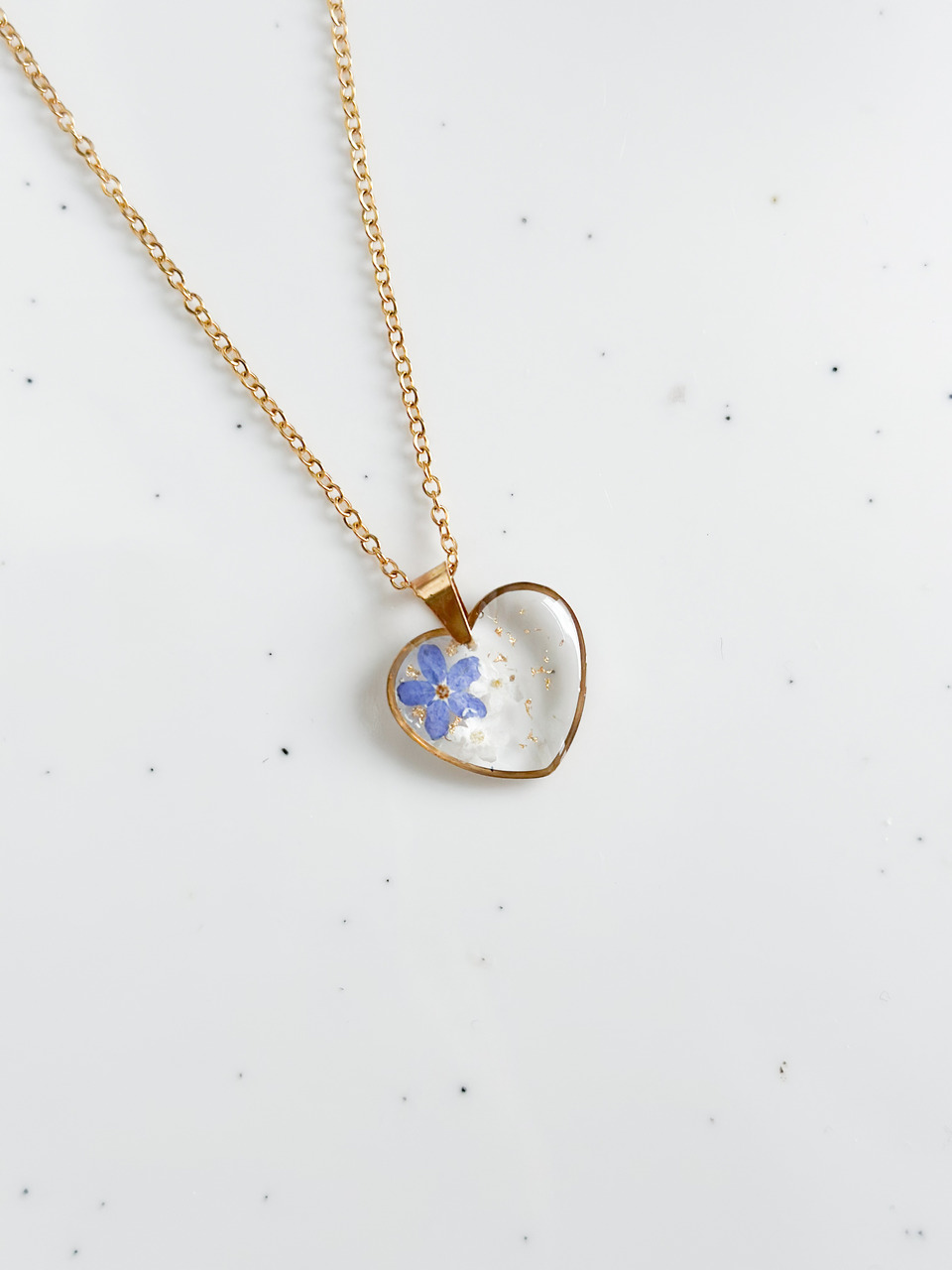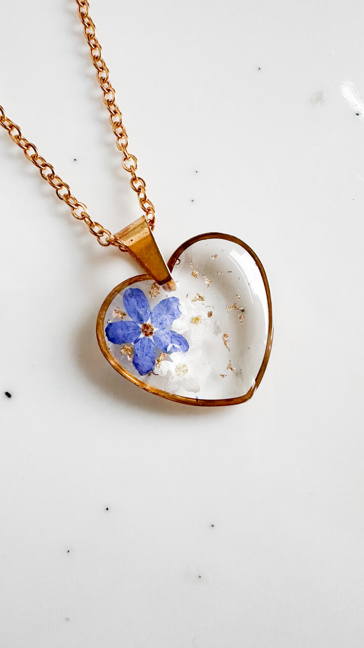 Delikatny naszyjnik z prawdziwymi kwiatami serduszko z żywicy. Ręcznie robiony naszyjnik z kwiatami – naturalny naszyjnik z niezapominajką.