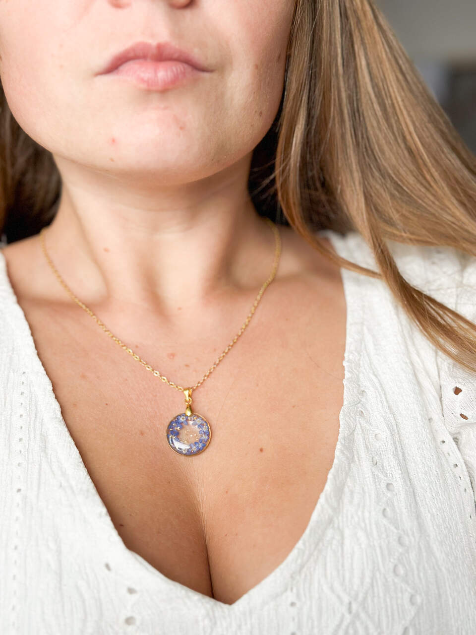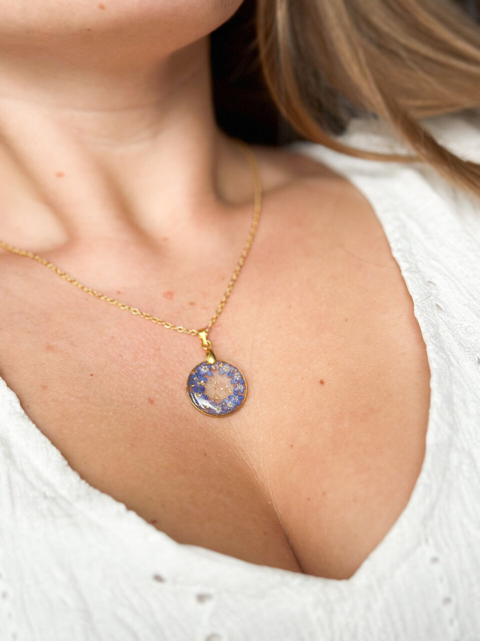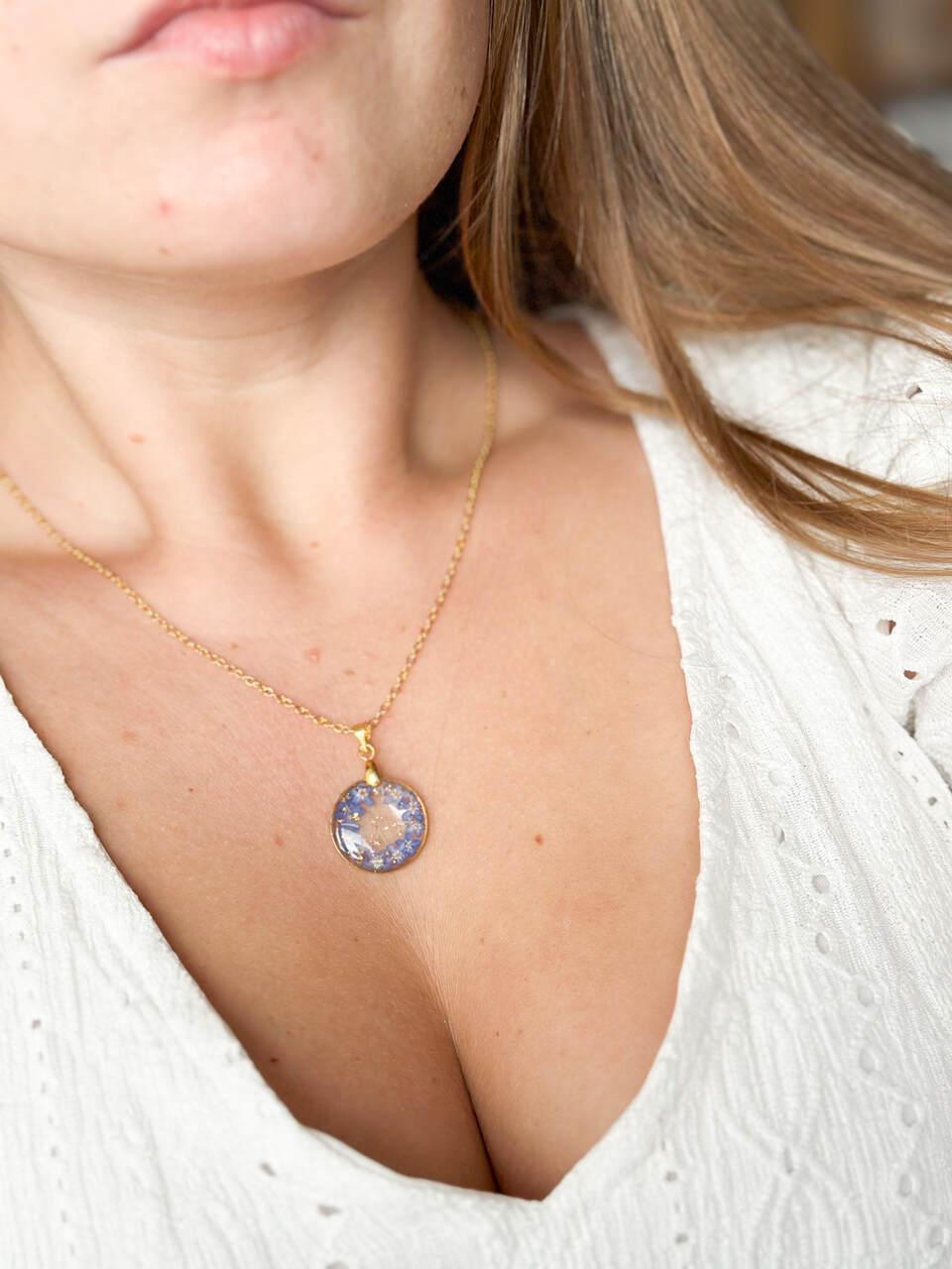 Delikatny naszyjnik z prawdziwymi kwiatami wianuszek z żywicy. Ręcznie robiony naszyjnik z kwiatami, naturalny naszyjnik z niezapominajkami w formie wianuszka.