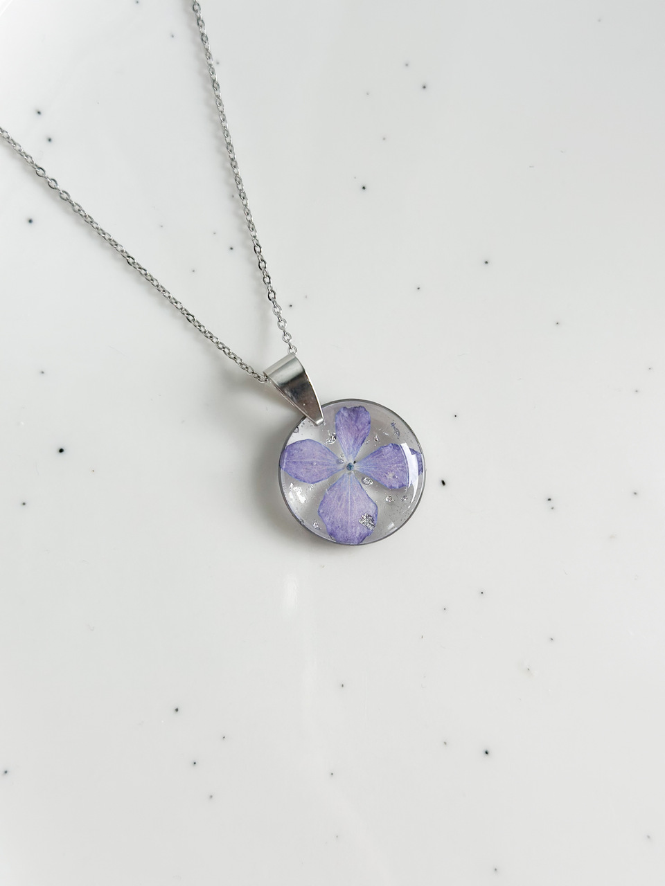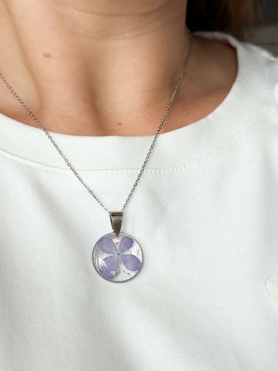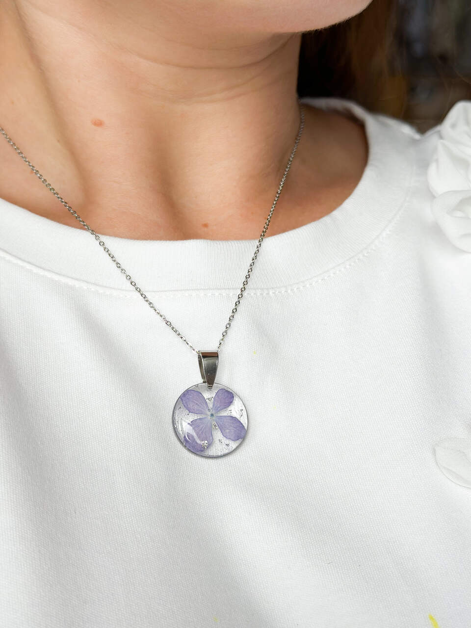 Zanurz się w subtelnym pięknie natury z wyjątkowym naszyjnikiem w kształcie kółka, w którym zatopiono prawdziwą, niebieską hortensję. Każdy kwiat został starannie wysuszony i utrwalony w przezroczystej żywicy epoksydowej, dzięki czemu jego kolor i struktura pozostają niezmienne przez lata. To delikatna biżuteria, która łączy elegancję z naturalnym urokiem.