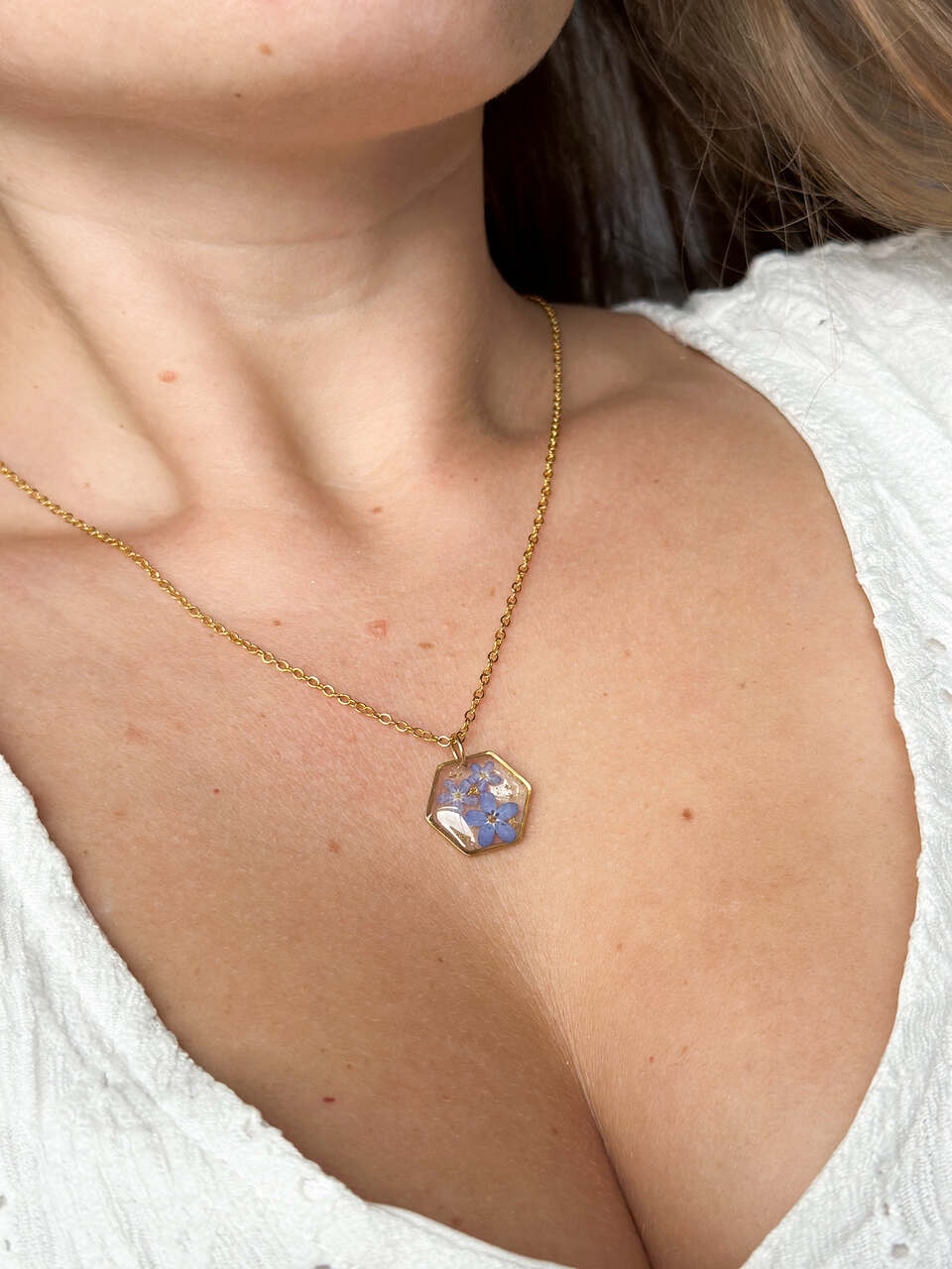 Odkryj wyjątkowy urok natury zamknięty w nowoczesnej formie. Ten elegancki naszyjnik z zawieszką w kształcie sześcianu kryje w sobie prawdziwe, suszone niebieskie niezapominajki zatopione w przezroczystej żywicy epoksydowej. Połączenie delikatnych kwiatów z geometryczną formą i złotym wykończeniem tworzy ponadczasowy, kobiecy dodatek.
