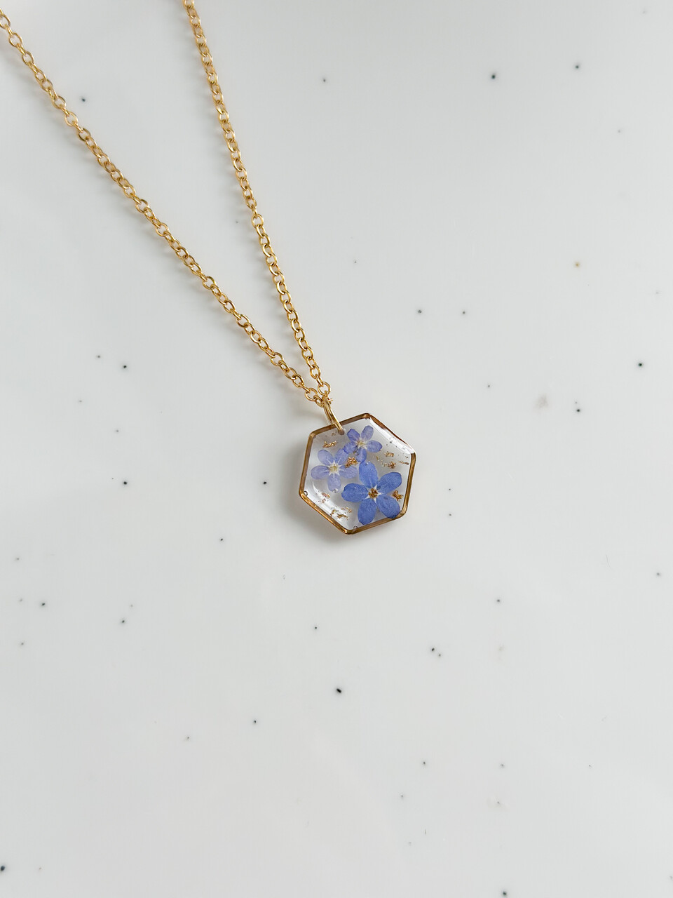 naszyjnik z niezapominajkami, biżuteria handmade, biżuteria z żywicy, rękodzieło, naszyjnik sześcian, naszyjnik złoty, naszyjnik z kwiatami, prezent dla niej, niebieskie niezapominajki, unikalna biżuteriaNaszyjnik z niezapominajką, sześcian