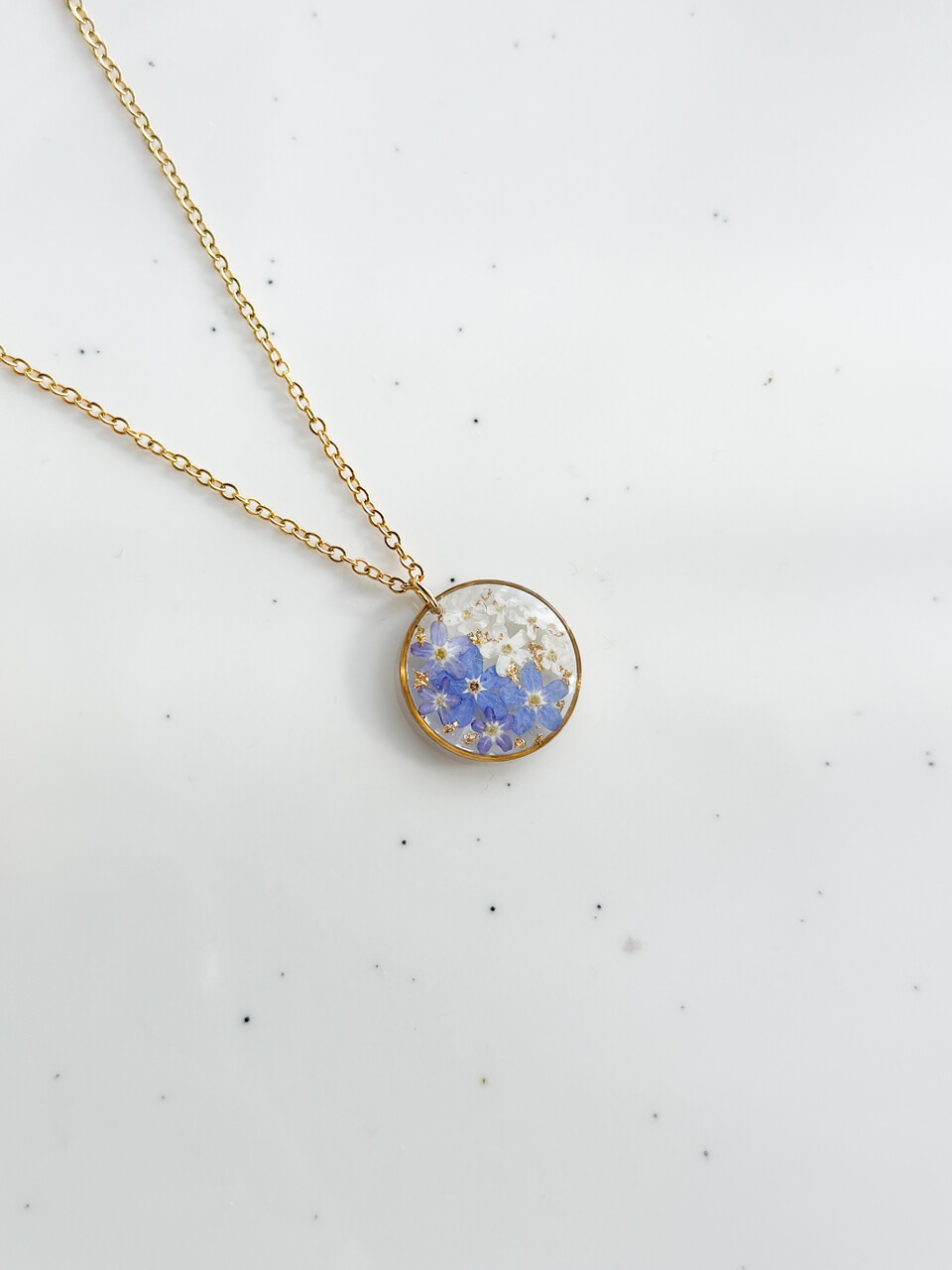 Naszyjnik Złote Koło z Niebieskimi i Białymi Niezapominajkami – Ręcznie Robiona Biżuteria z Żywicy