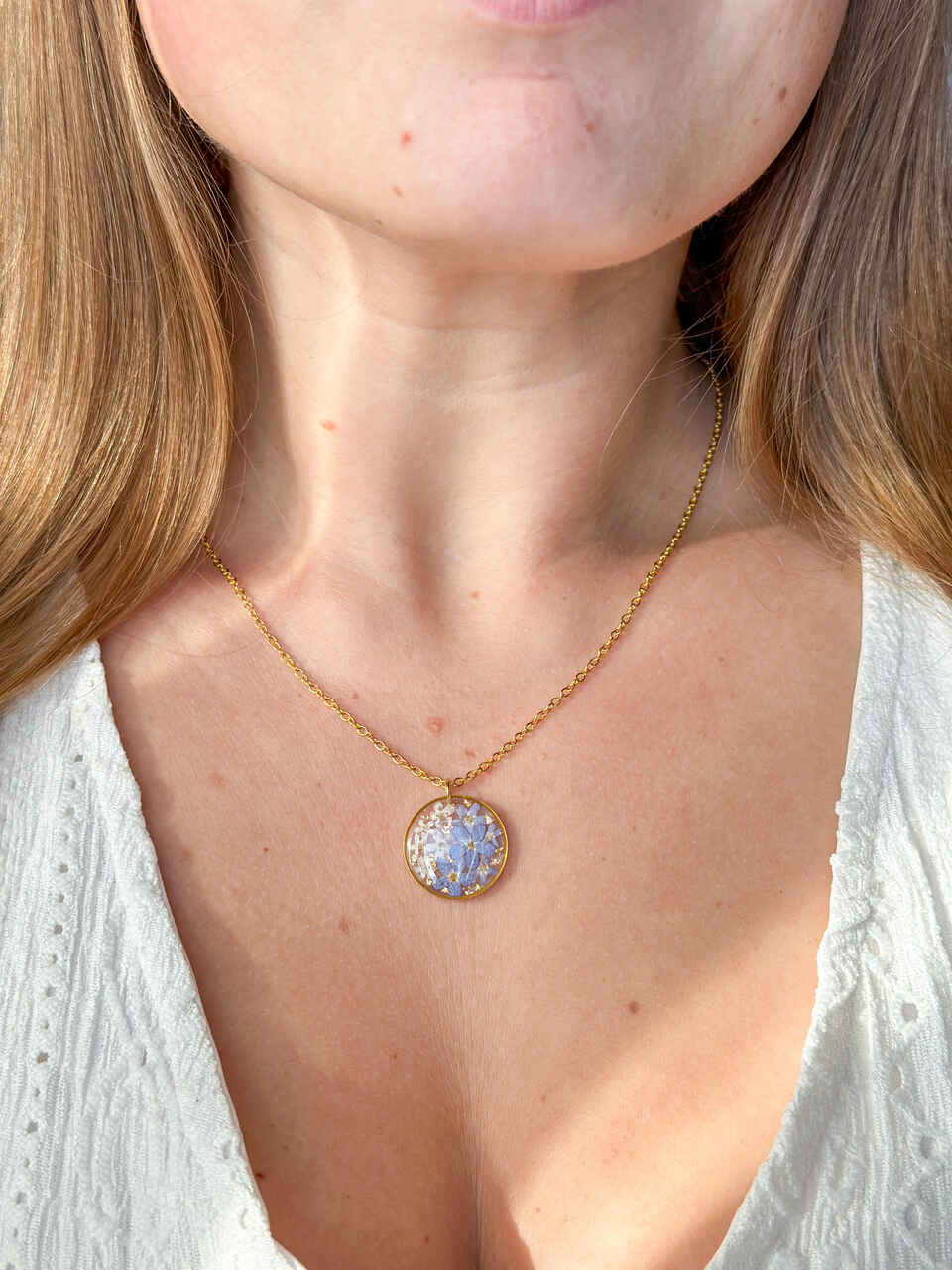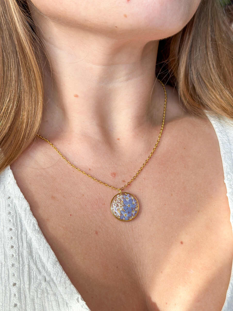Zachwyć się subtelnym połączeniem natury i elegancji. Ten delikatny naszyjnik w kształcie koła kryje w sobie prawdziwe, ręcznie suszone niezapominajki w odcieniach niebieskim i białym, zatopione w przejrzystej żywicy epoksydowej. Złote wykończenie ze stali chirurgicznej dodaje biżuterii ciepłego blasku i ponadczasowego charakteru.