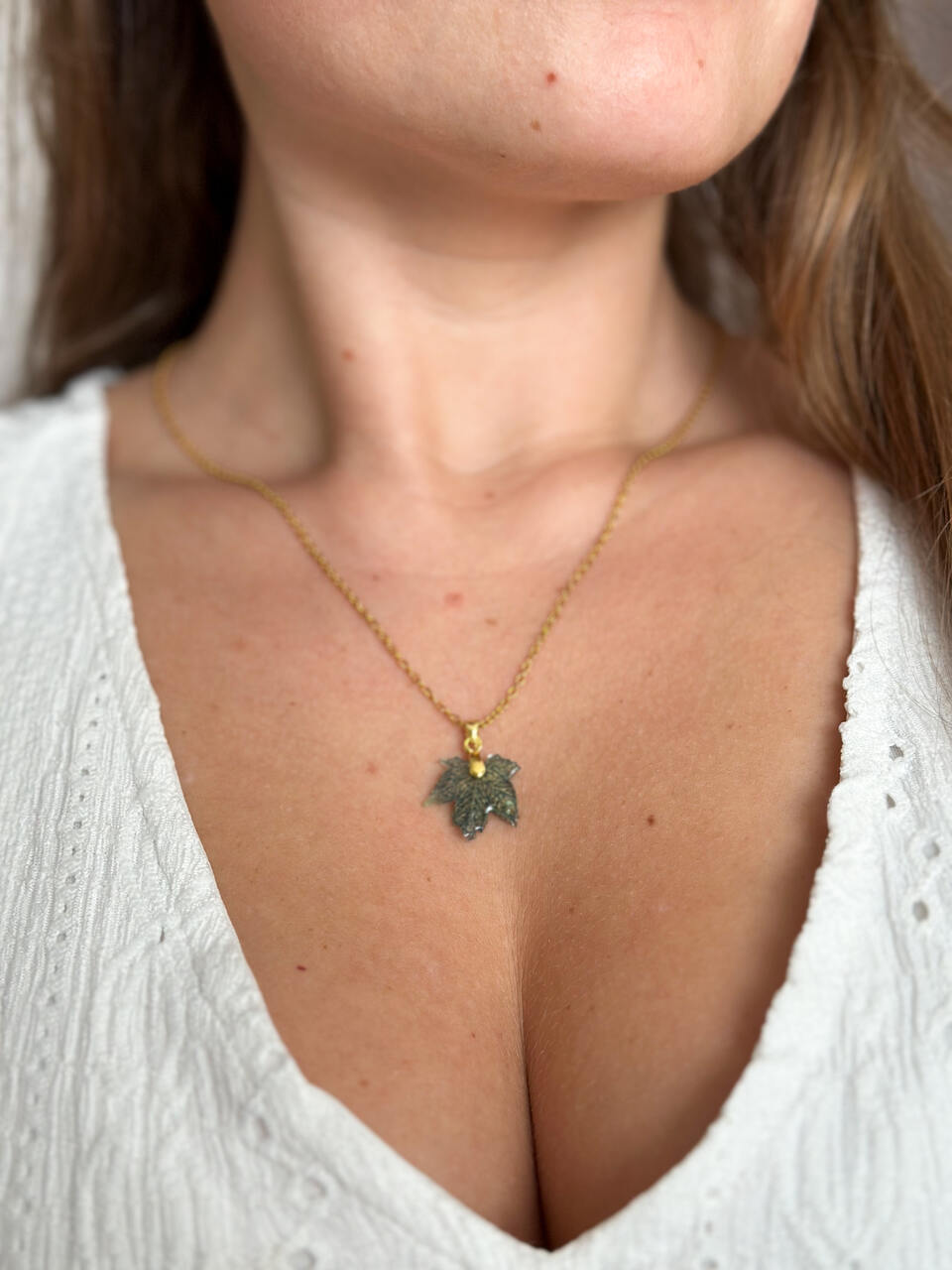 Naszyjnik Zielony Liść – Ręcznie Malowana Biżuteria z Żywicy, Mieniący się i Lekki