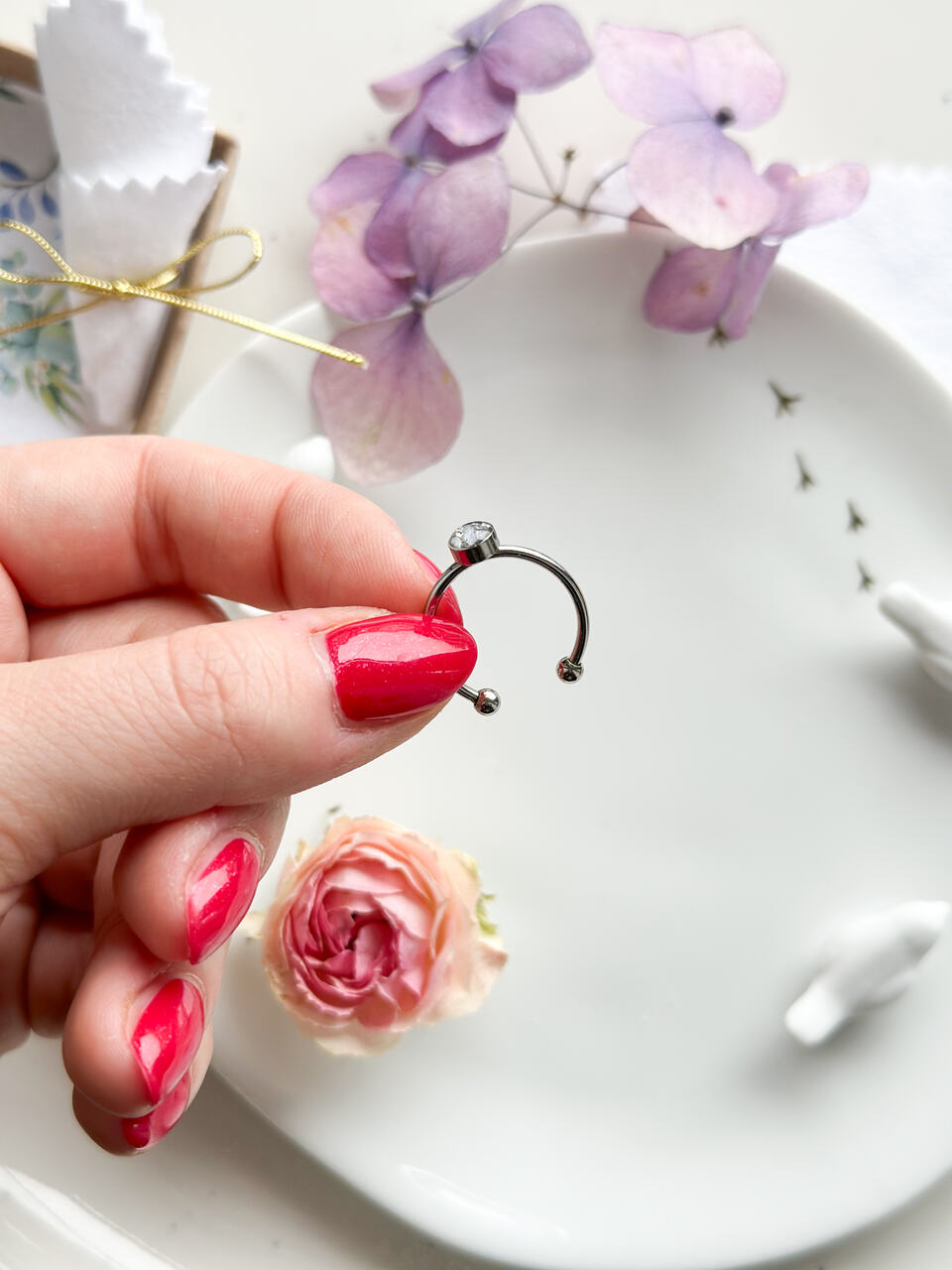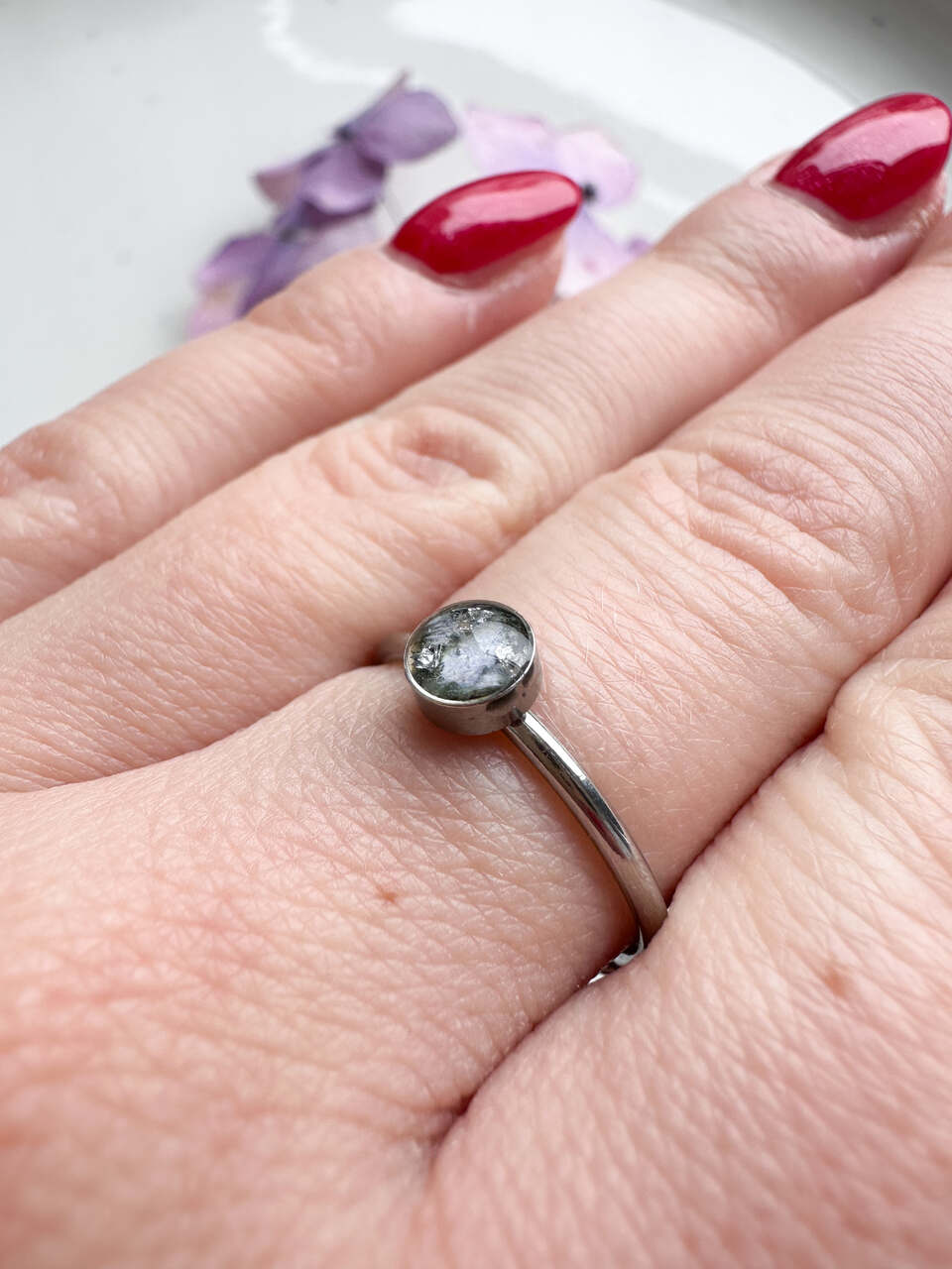 Przedstawiam wyjątkowy pierścionek z prawdziwą niebieską hortensją, zamkniętą w przezroczystej żywicy epoksydowej i osadzoną w eleganckiej srebrnej oprawie. Delikatne oczko o wymiarach 0,4 cm oraz regulowana obrączka sprawiają, że pierścionek doskonale dopasowuje się do każdego rozmiaru palca, wprowadzając naturalne piękno do Twojej codziennej biżuterii.