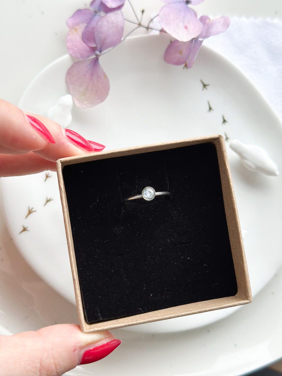 Pierścionek otrzymasz w eleganckim pudełeczku wypełnionym naturalną wełną drzewną i przewiązanym jutową kokardką – idealne opakowanie na prezent.